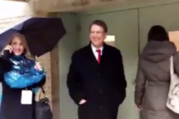 In the video, the crowd pursues a group of people, including McCrory and Fox News' Lou Dobbs. A man is heard calling McCrory an “anti-gay bigot” and an “asshole.”