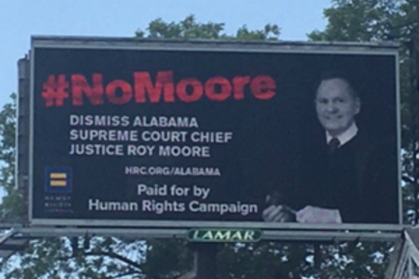 holding a gavel with “#NoMoore: Dismiss Alabama Supreme Court Chief