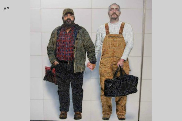 Kellogg, 47. Both are casually dressed. Kellogg is wearing overalls
