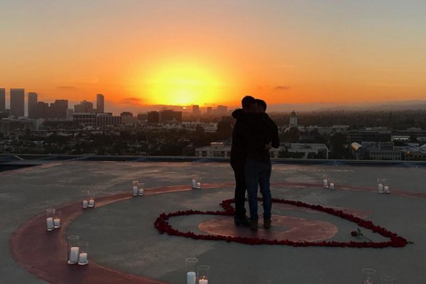 romantic photo of the pair sharing a hug on a rooftop surrounded by