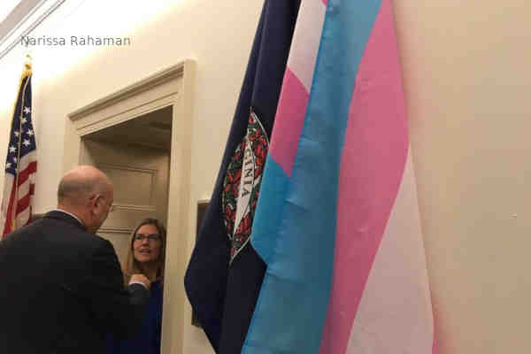 Wexton, a Democrat, is displaying a transgender pride flag outside
